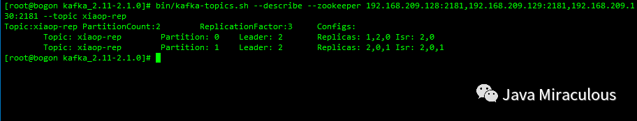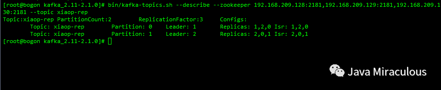 bin/kafka-topics.sh --describe --zookeeper 192.168.209.128:2181,192.168.209.129:2181,192.168.209.130:2181 --topic xiaop-rep