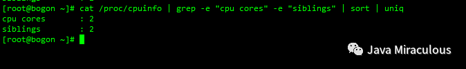 cat /proc/cpuinfo | grep -e "cpu cores" -e "siblings" | sort | uniq