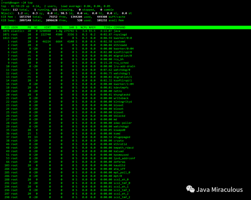 注:%CPU显示的是进程占用1个核的百分比,而不是整个cpu的百分比(因为可能是多核),有时候可能会大于100,那是因为该进程启用了多线程占用了多个核心,但是不会超过总核数*100