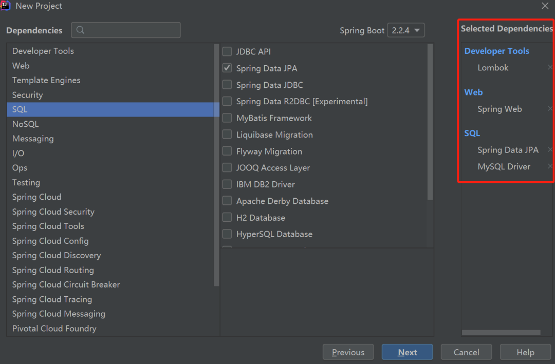 在 IDEA 新建一个项目 02-sql-spring-data-jpa,勾选如下的依赖,相关依赖下载慢的话可以更换国内的镜像源: