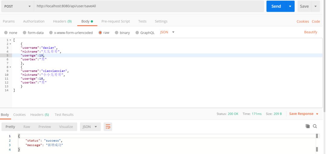 重新运行,使用 Postname 方式访问 http://localhost:8080/api/user/search?nickname=瑞&page=0&size=5 ,可以看到返回如下所示的数据: