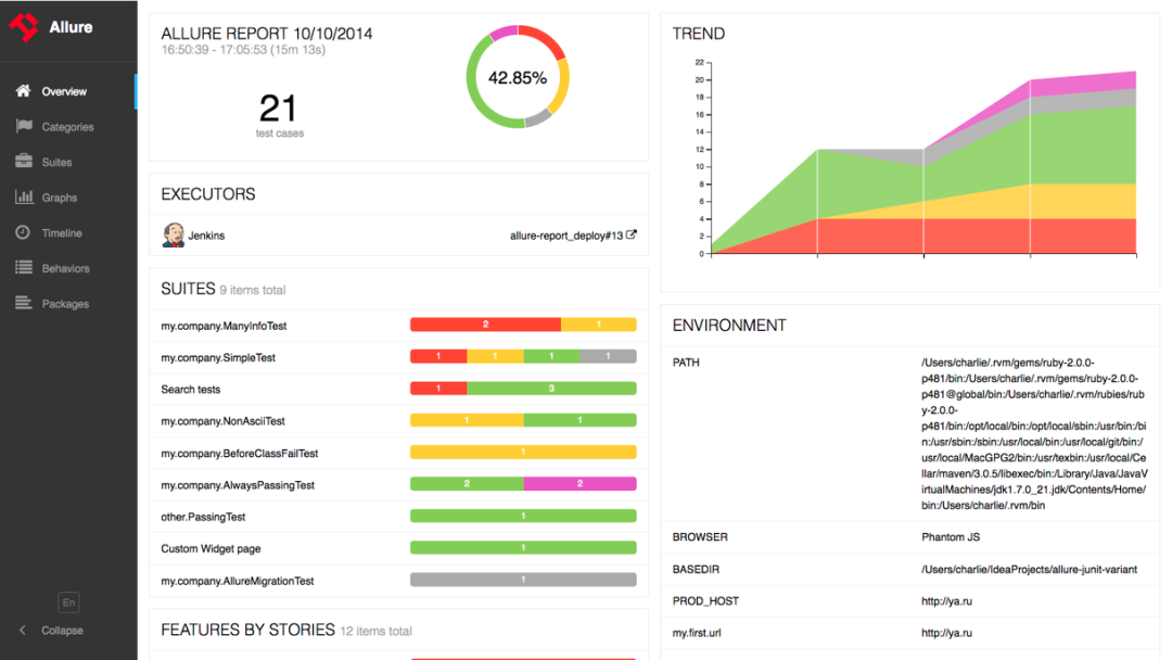 上面的测试报告首页中展示了此次测试的测试用例数量以及成功用例、失败用例、跳过用例的比例、测试环境、SUITES、FEATURES BY STORIES 等基本信息。当与 Jenkins 做了持续置成后,TREND 区域还将显示,历次测试的通过情况。
