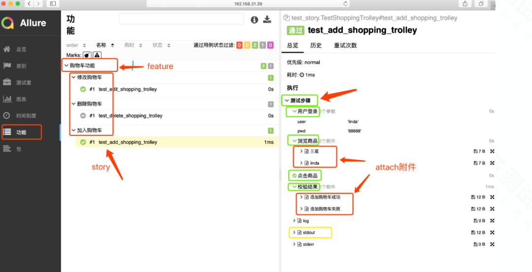 Behaviors 页面,按照 FEATURES 和 STORIES 展示测试用例的执行结果; Suites 页面,Allure 测试报告将每一个测试脚本,作为一个 Suite。在首页里点击 Suites 区域内的任何一条 Suite,都会进入 Suites 页面; Graphs 页面,展示了此次测试结果的统计信息,比如测试用例执行结果状态、测试用例重要等级分布、测试用例执行时间分布等; 测试用例详情页面,在 Suites 页面上点击任何一条测试用例,Suites 页面的右侧将展示这条用例的详细执行情况。在这个页面可以看到测试用例的每个步骤,以及每个步骤的执行结果,包括步骤里面添加的链接、图片、网页片段或者视频作为重要信息的补充。在这里可以一目了在的看到用例失败的原因。