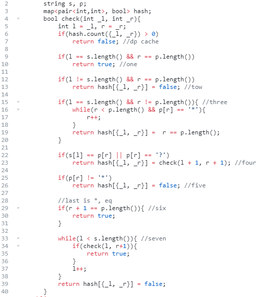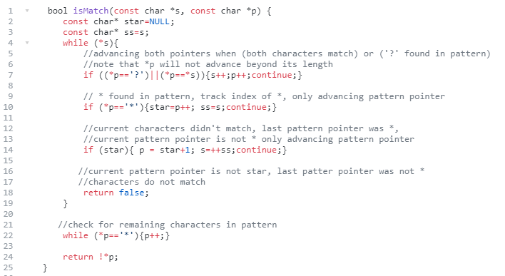 代码如下,只需要记录上次 * 的位置,只向上回溯一次。