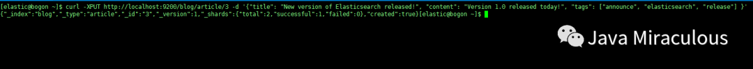 curl -XPUT http://localhost:9200/blog/article/3 -d '{"title": "New version of Elasticsearch released!", "content": "Version 1.0 released today!", "tags": ["announce", "elasticsearch", "release"] }'