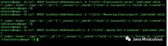 curl -XPOST localhost:9200/books/es/1 -d '{"title":"Elasticsearch server","published":2013}'