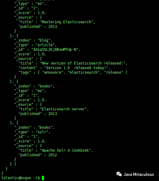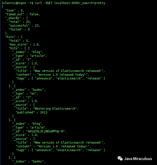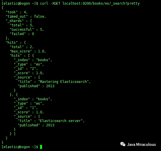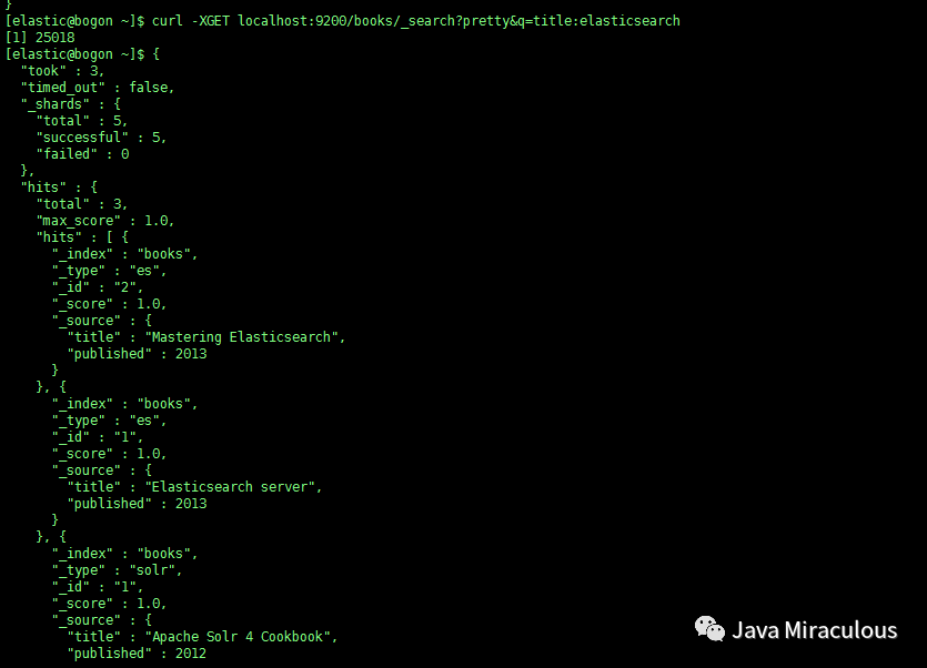 如果想找到books索引中title字段包含elasticsearch一词的所有文档,可以这样查询:
