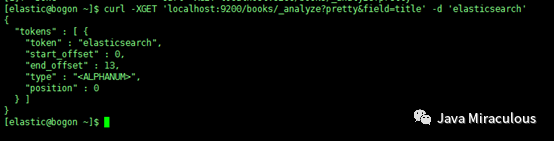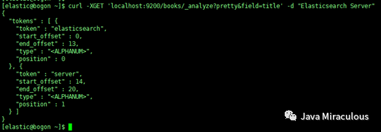 curl -XGET 'localhost:9200/books/_analyze?pretty&field=title' -d "Elasticsearch Server"(注意,这里有个坑,就是,如果后面加参数并且要和pretty配合使用的时候,整个表达式需要用单引号括起来,不然报错,因为在linux系统中,&字符是会被linux shell解析的)。