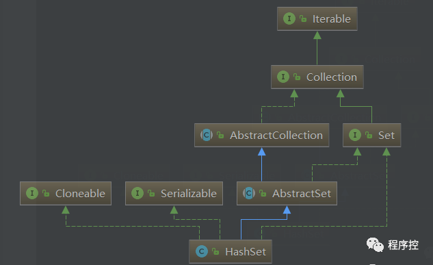 public class HashSet<E> extends AbstractSet<E>implements Set<E>, Cloneable, java.io.Serializable {}{