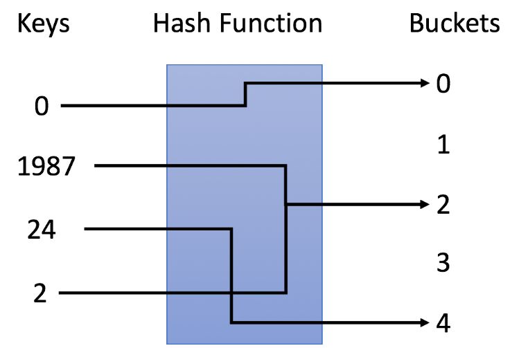 如图,0 映射到桶 0, 1987 和 2 映射到桶 2, 24 映射到桶 4.