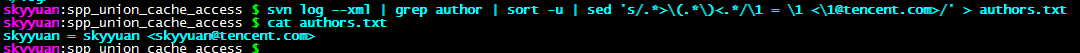 svn log --xml | grep author | sort -u | sed 's/.*>\(.*\)<.*/\1 = \1 <\1@tencent.com>/' > authors.txt