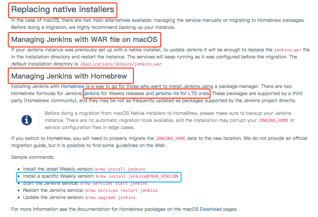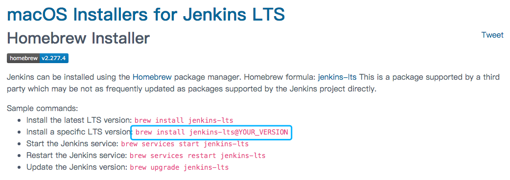 这个页面给出的指示表明我们可以使用brew install jenkins-lts@YOUR_VERSION