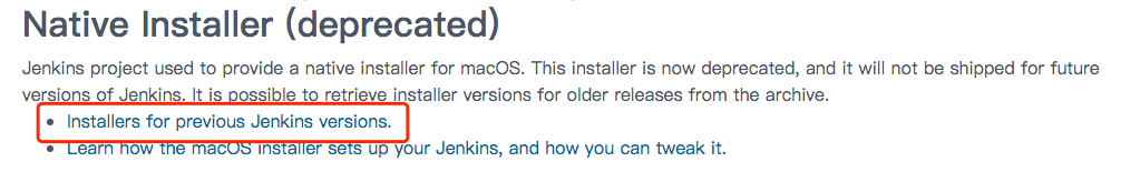 网页中有一段说明我截了图,大致的意思是说作为对弃用 jenkins macOS 本机安装程序的替代,mocOS 下你可以直接使用 War 包或者使用 Homebrew 来安装管理 jenkins。