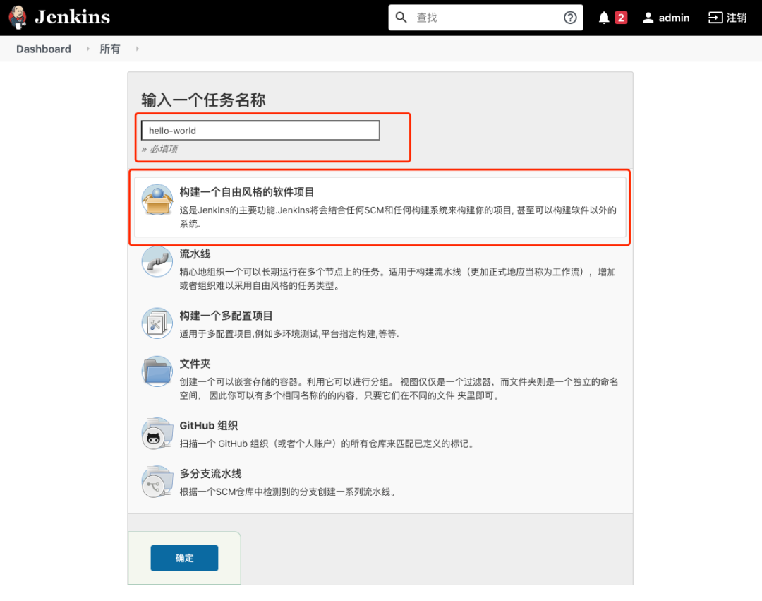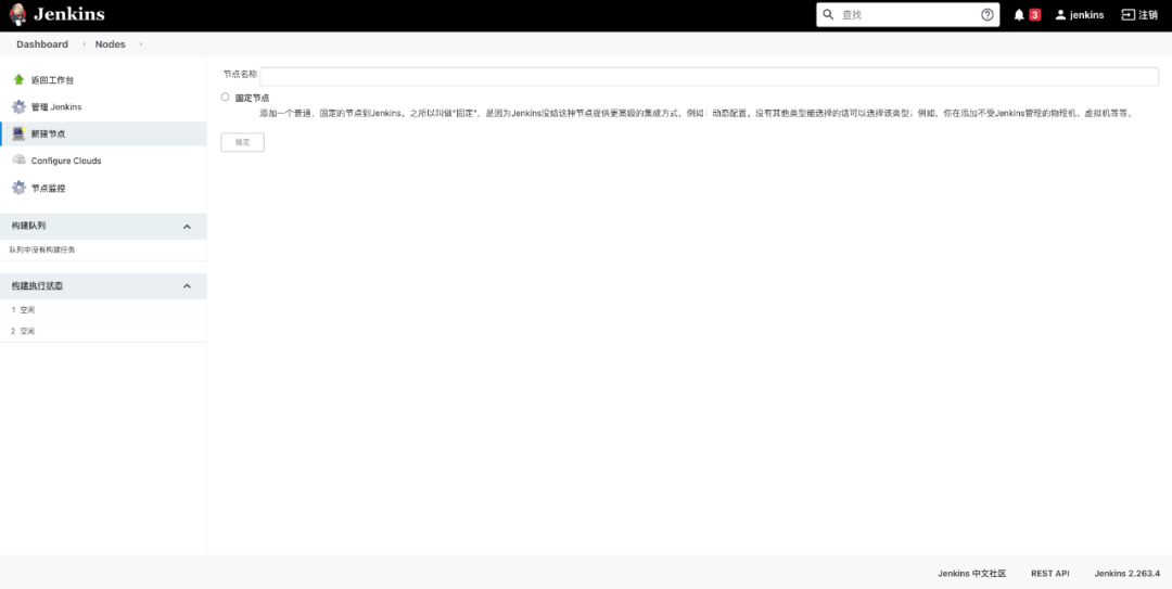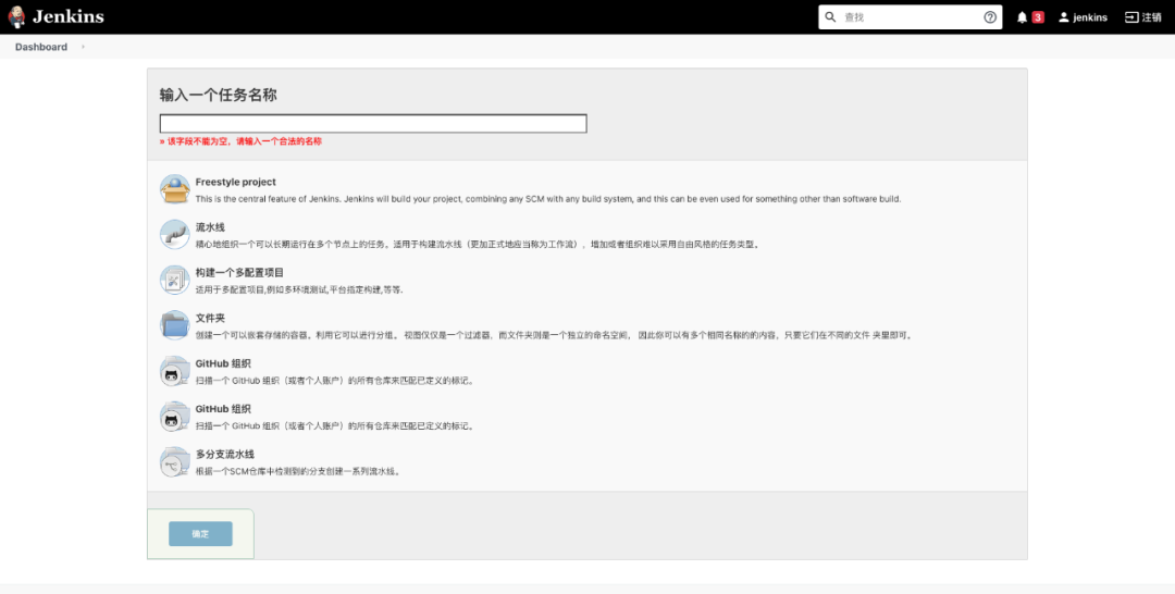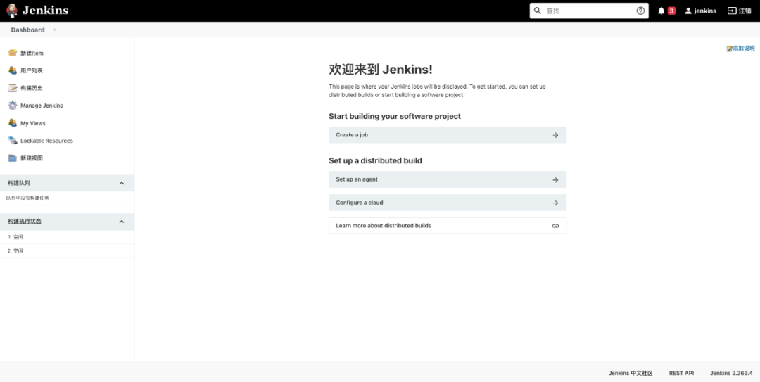 首页的中间部分主要提供了一些 jenkins 新手可能会用到的链接,第一个便是任务创建链接。