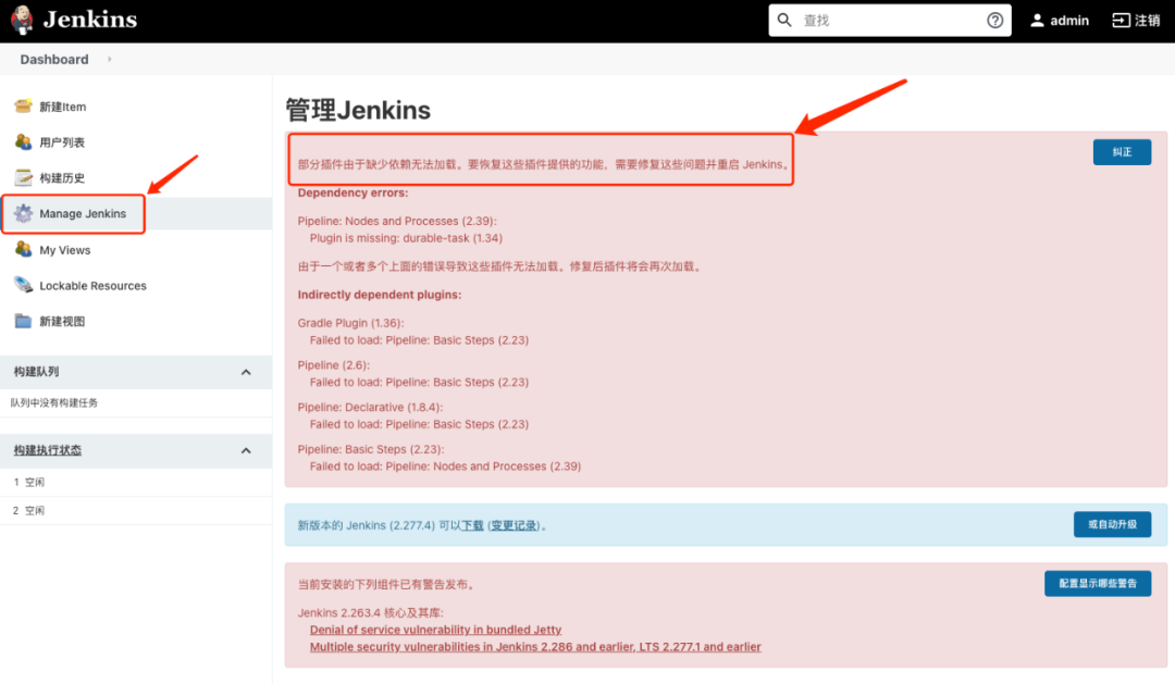 “部分插件由于缺少依赖无法加载。要恢复这些插件提供的功能,需要修复这些问题并重启 Jenkins。