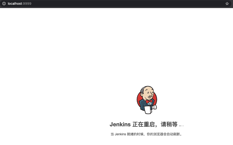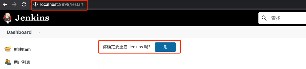 按照页面的提示我们需要重启一下就 jenkins 这样才能使插件生效,然后我们在浏览器里输入http://localhost:9999/restart