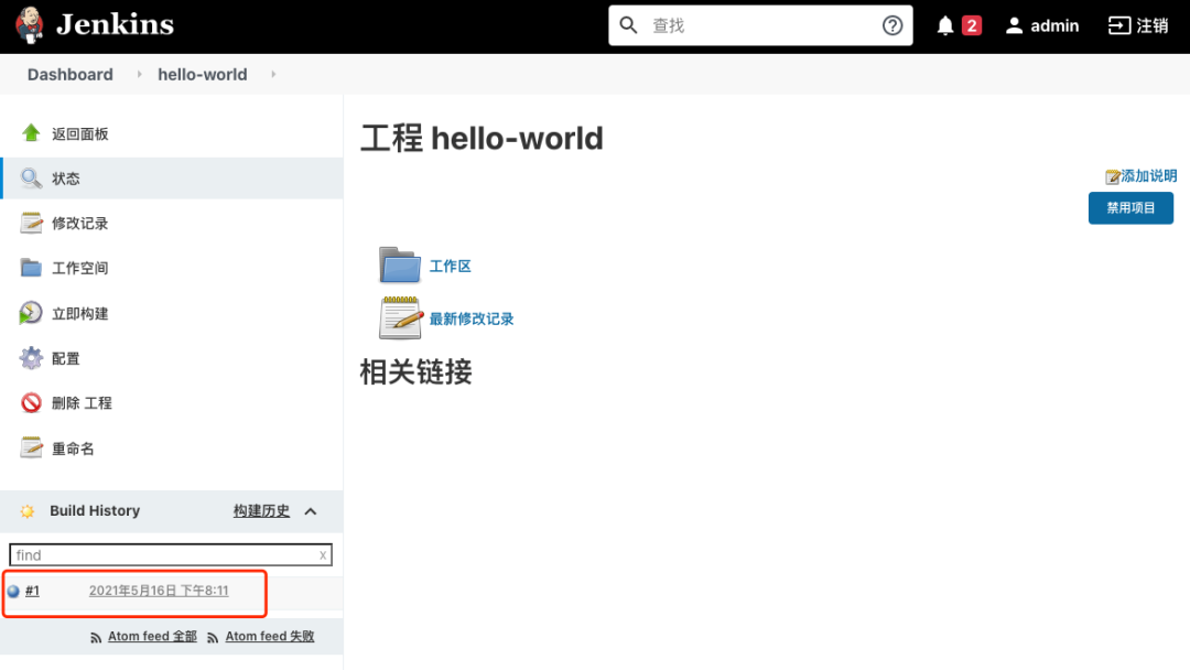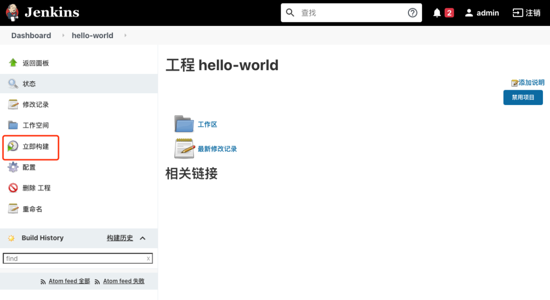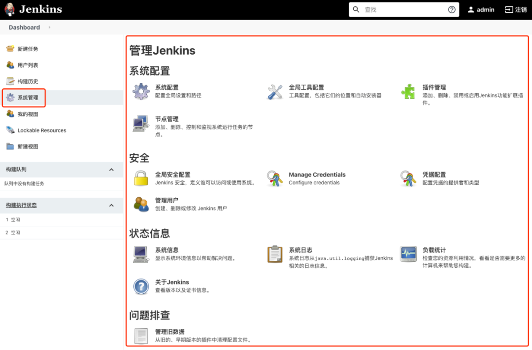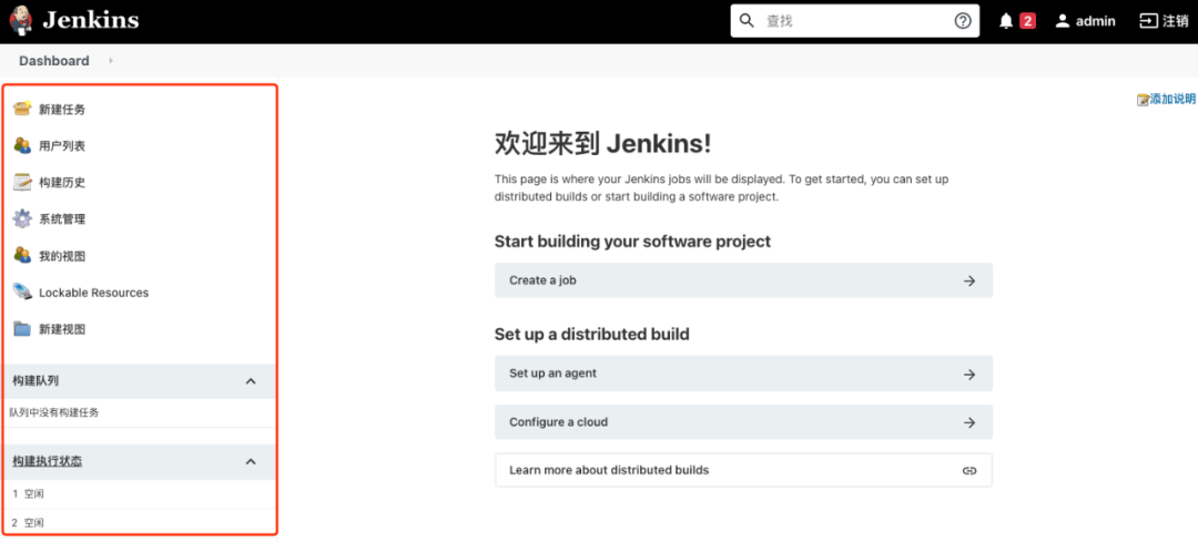 在登陆页面中输入 admin 以及它的密码(jenkins 安装时自动创建的用户,密码信息启动日志中有)再次进入 jenkins 的首页, 发现页面的菜单显示跟重启之前有一些差别,应该是重启之后本地化插件生效了,菜单以中文的形式显示。