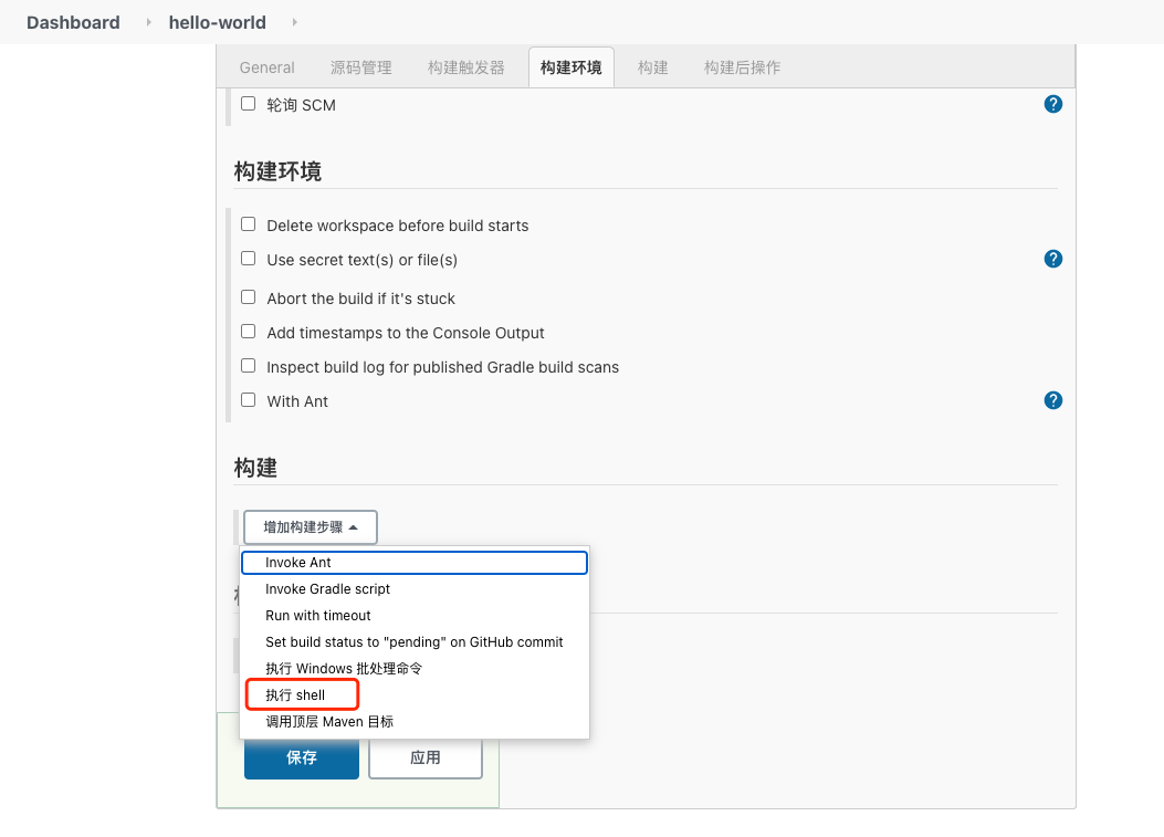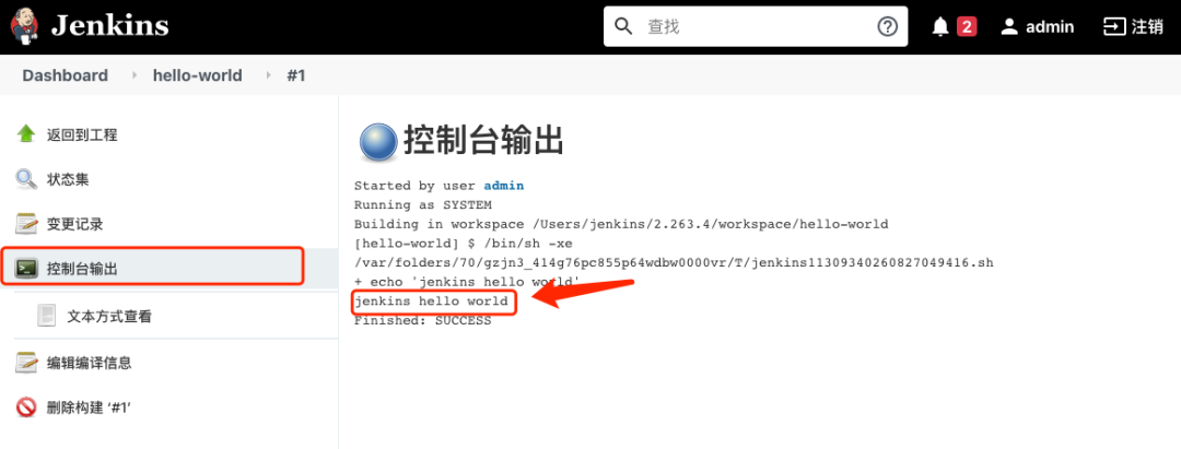job正常执行并打印出“jenkins hello world“。