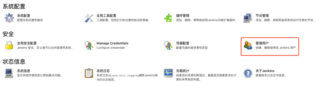 首页的左边是常用的功能菜单的链接。依次分别是"新建Item","用户列表","构建历史","Manage Jenkins","My Views"等。我们先看下"Manage Jenkins"吧,点击进入。
