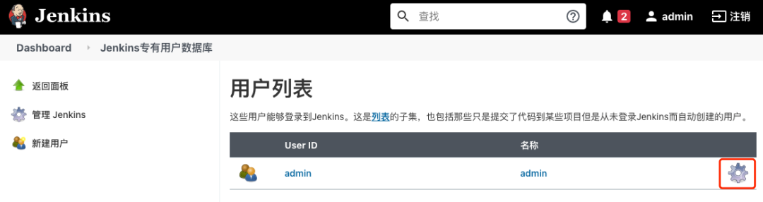 点击"管理用户"的链接进入"用户列表",在给出的所有用户列表中找出 admin 用户,点击它的设置按钮。