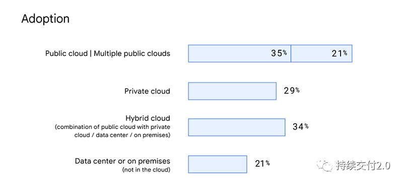 与 DevOps 2019 的加速状态一致,越来越多的组织正在选择多云和混合云解决方案。在我们的调查中,受访者被问到他们的主要服务或应用程序在哪里,公共云的使用率正在上升。56% 的受访者 表示使用公共云(包括多个公共云),比 2019 年增加 5% 。今年,我们还专门询问了多云的使用情况,21% 的受访者表示部署到多个公共云。21% 的受访者表示不使用云,而是使用数据中心或内部部署解决方案。最后,34% 的受访者报告使用混合云,29% 报告使用私有云。