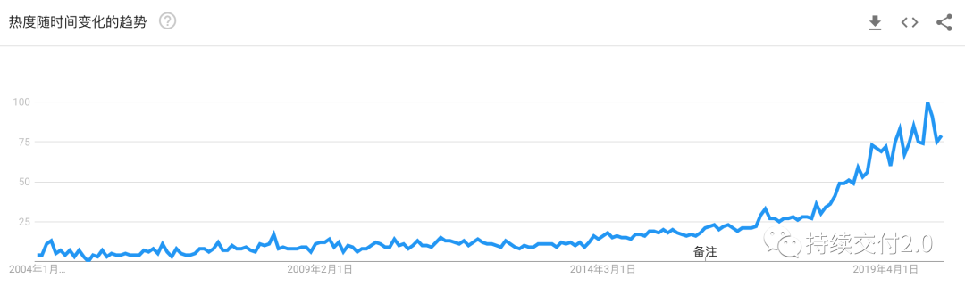 随着谷歌的成功,作为一种管理工具,OKRs 开始流行,下图是自2004年起,OKR的搜索指数变化趋势。