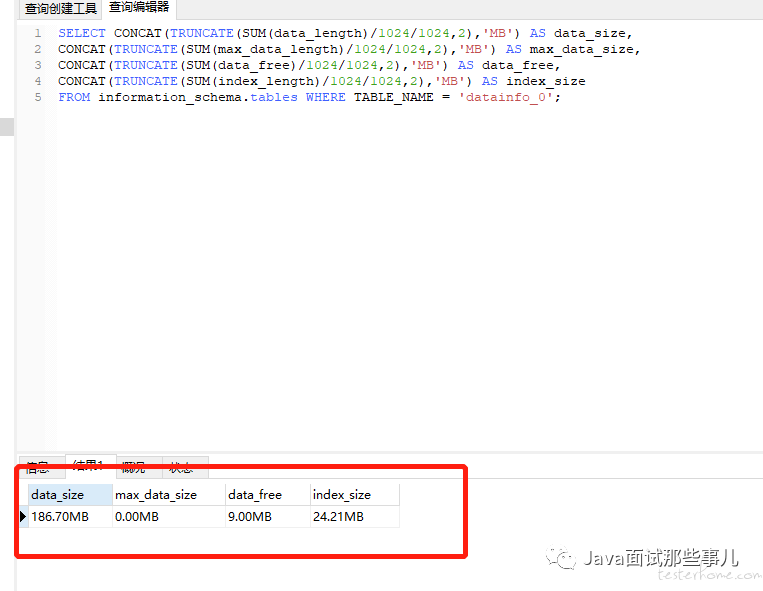 SELECT CONCAT(TRUNCATE(SUM(data_length)/1024/1024,2),'MB') AS data_size,CONCAT(TRUNCATE(SUM(max_data_length)/1024/1024,2),'MB') AS max_data_size,CONCAT(TRUNCATE(SUM(data_free)/1024/1024,2),'MB') AS data_free,CONCAT(TRUNCATE(SUM(index_length)/1024/1024,2),'MB') AS index_sizeFROM information_schema.tables WHERE TABLE_NAME = 'datainfo';