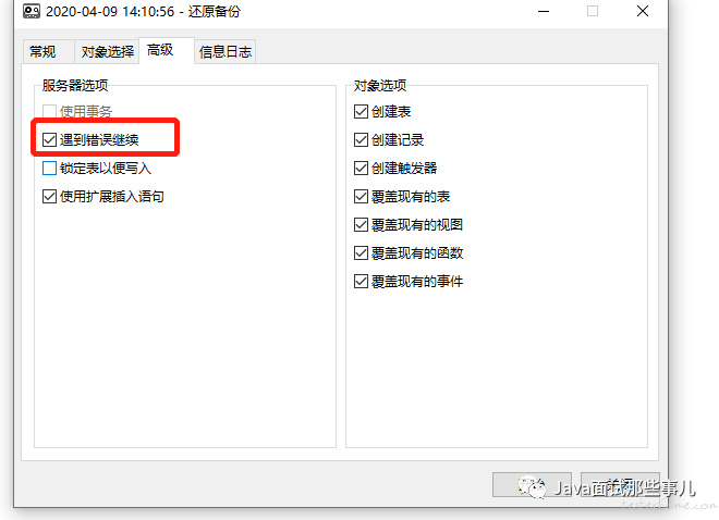 还原时当成一个事务进行了,遇到错误就停止了。更改配置