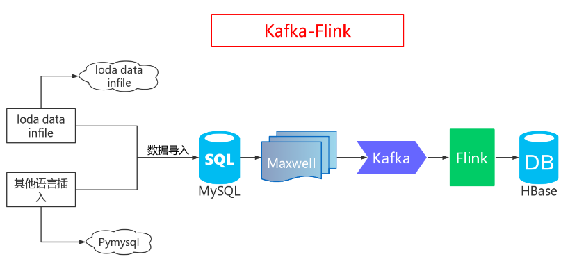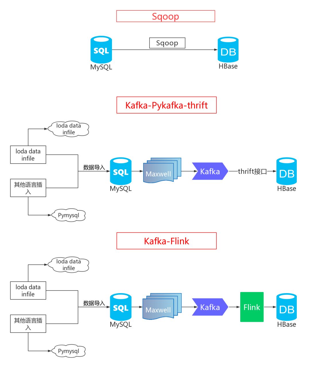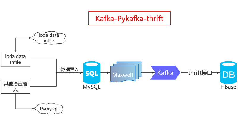 mysql插入->入库mysql->记录binlog->maxwell提取binlog->返回json给kafka->kafka消费端通过thrift接口->写入hbase。