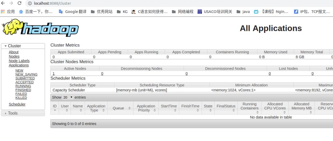 同理,可以通过上述方法查看ResourceManager的端口,默认为8088。
