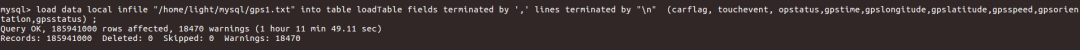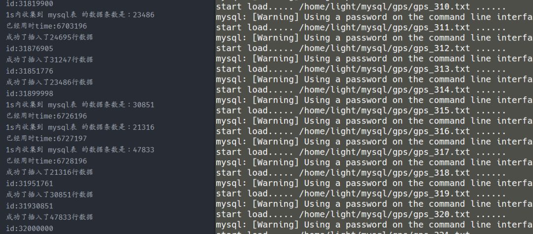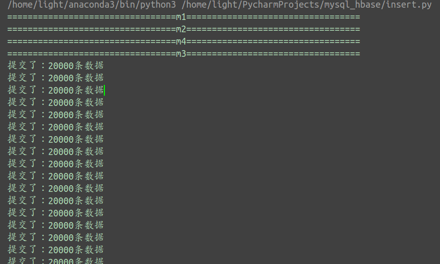 上述运行后,开始MySQL数据插入,这里插入采用4个多进程进行程序插入,速度非常快。
