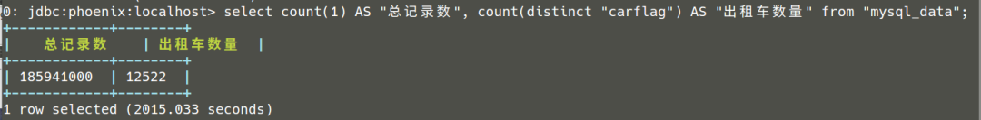 而Phoenix查询时间为2015.033秒,大约33分钟左右。