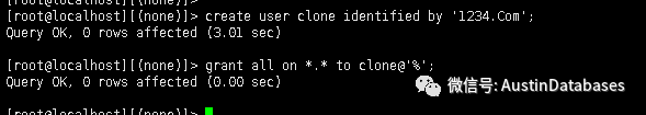 2 创建操作的账户,建议为了降低操作的复杂度,可以设置为super ,实际一边需要备份的权限,另一个边CLONE_ADMIN 的权限。