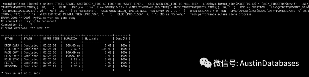 select STAGE, STATE, CAST(BEGIN_TIME AS TIME) as "START TIME", CASE WHEN END_TIME IS NULL THEN LPAD(sys.format_time(POWER(10,12) * (UNIX_TIMESTAMP(now()) - UNIX_TIMESTAMP(BEGIN_TIME))), 10, ' ') ELSE LPAD(sys.format_time(POWER(10,12) * (UNIX_TIMESTAMP(END_TIME) - UNIX_TIMESTAMP(BEGIN_TIME))), 10, ' ') END as DURATION, LPAD(CONCAT(FORMAT(ROUND(ESTIMATE/1024/1024,0), 0), " MB"), 16, ' ') as "Estimate", CASE WHEN BEGIN_TIME IS NULL THEN LPAD('0%', 7, ' ') WHEN ESTIMATE > 0 THEN LPAD(CONCAT(CAST(ROUND(DATA*100/ESTIMATE, 0) AS BINARY), "%"), 7, ' ') WHEN END_TIME IS NULL THEN LPAD('0%', 7, ' ') ELSE LPAD('100%', 7, ' ') END as "Done(%)" from performance_schema.clone_progress;