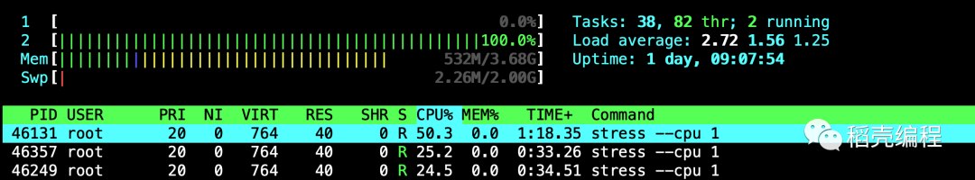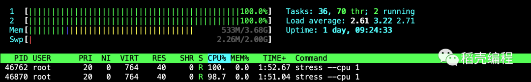 下面再看多核CPU的场景,已知当前宿主机的核数为2,其上运行了两个容器,一个---cpu-shares参数值为1024、另一个设置为512,此时每个容器都能占用一个CPU,且占用情况均为100%,因为当前的CPU资源是足够的,启动容器如下所示: