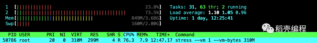 [root@localhost ~]# docker run --rm --cpus=1.5 -it polinux/stress stress --cpu 2