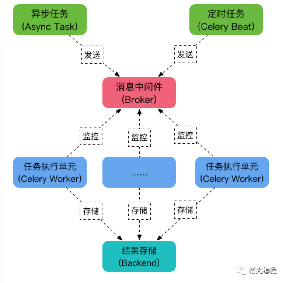 Celery是Python语言实现的分布式队列服务,可以用它来实现定时任务与异步任务,核心角色如下:
