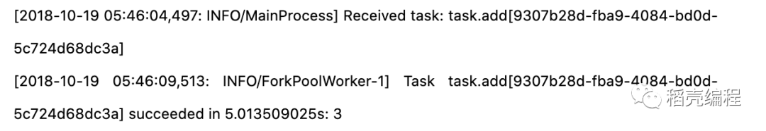 在上面, 我们从task.py文件中导入了add任务对象,然后使用delay()方法将任务发送到消息中间件(Broker),Celery Worker 进程监控到该任务后,就会进行执行,我们将窗口切换到Worker的启动窗口,会看到多了两条日志: