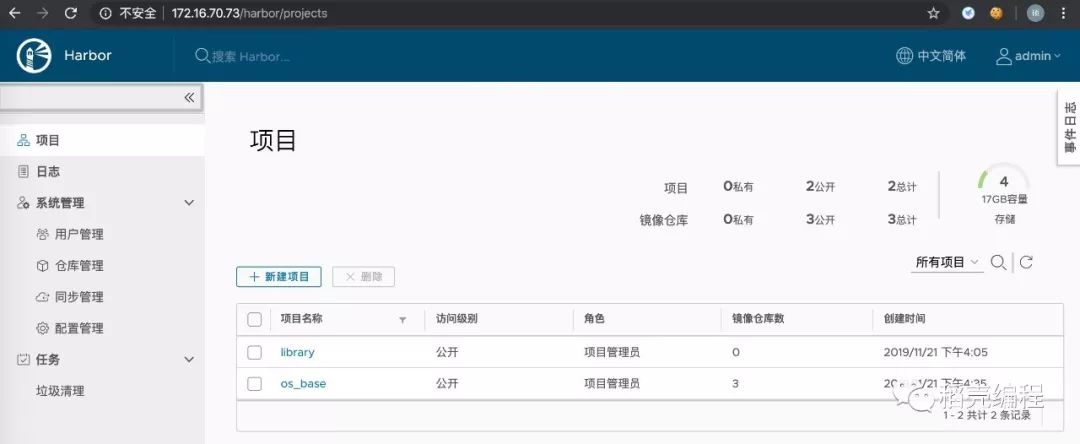 此处会分别介绍在Harbor新老版本中进行镜像清理的方式,老版本采用v1.5、新版采用v1.8。新版本中解决了在老版本Harbor中镜像清理的繁琐的过程,可以在图形化界面中配置垃圾回收,实现镜像清理。