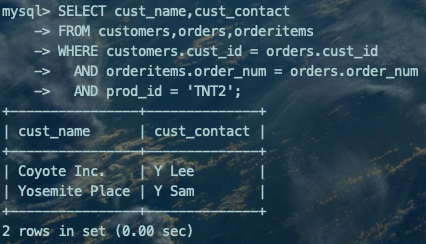 SELECT cust_name,cust_contact FROM customers,orders,orderitems WHERE customers.cust_id = orders.cust_id AND orderitems.order_num = orders.order_num AND prod_id = 'TNT2';