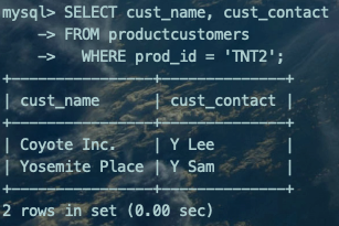 这条语句创建一个名为productcustomers的视图,它联结三个表,以返回已订购了任意产品的所有客户的列表。如果执行SELECT * FROM productcustomers,将列出订购了任意产品的客户。为检索订购了产品TNT2的客户,可如下进行: