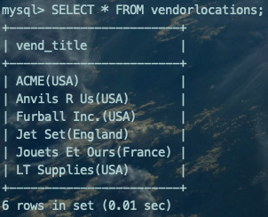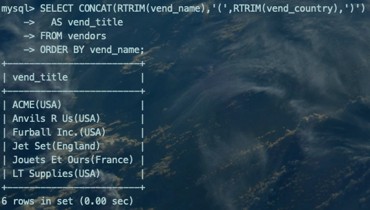 SELECT CONCAT(RTRIM(vend_name),'(',RTRIM(vend_country),')') AS vend_titleFROM vendorsORDER BY vend_name;