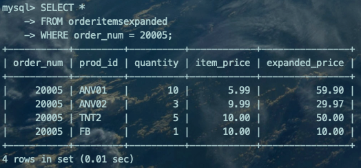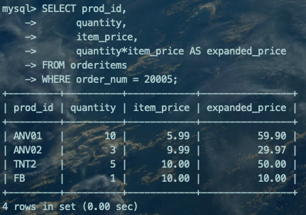 SELECT prod_id, quantity, item_price, quantity*item_price AS expanded_priceFROM orderitemsWHERE order_num = 20005;