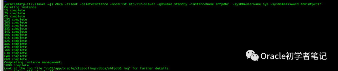 dbca -silent -deleteInstance -nodeList atp-112-slave2 -gdbName standby -instanceName shfpdb2 -sysDBAUserName sys -sysDBAPassword admin