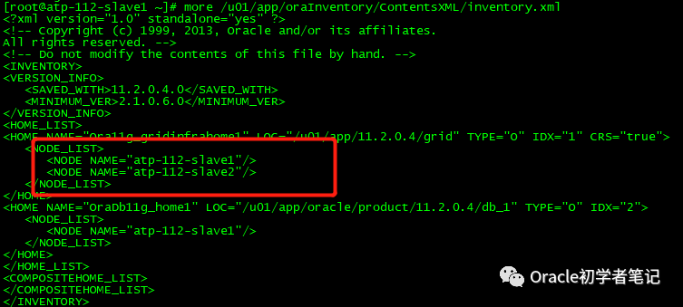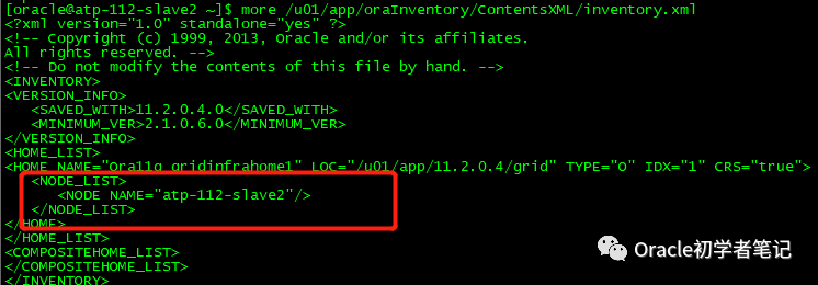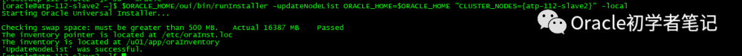 $ORACLE_HOME/oui/bin/runInstaller -updateNodeList ORACLE_HOME=$ORACLE_HOME "CLUSTER_NODES={atp-112-slave2}" -local