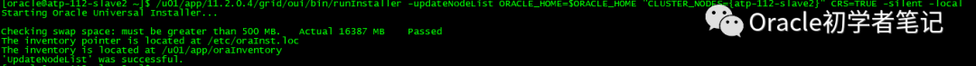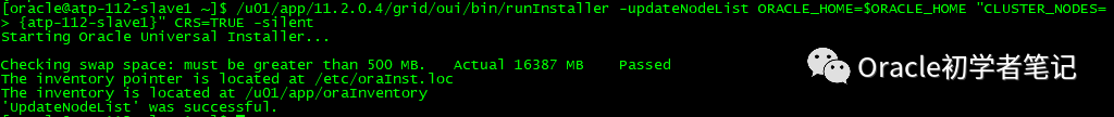 /u01/app/11.2.0.4/grid/oui/bin/runInstaller -updateNodeList ORACLE_HOME=$ORACLE_HOME "CLUSTER_NODES={atp-112-slave2}" CRS=TRUE -silent -local