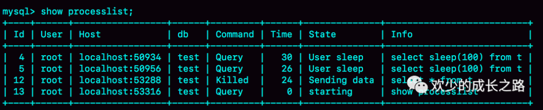 所以在show processlist列表中会把connection改成killed,也就是我们看到的状态。