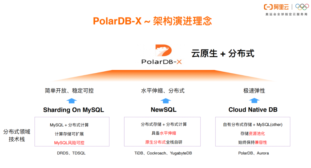 PolarDB-X结合了Sharding On MySQL、NewSQL、Cloud Native DB几种数据库理念的精华,具有云原生分布式的特性,底层使用了PolarDB云原生数据库的技术,上层用到了很多分布式技术。