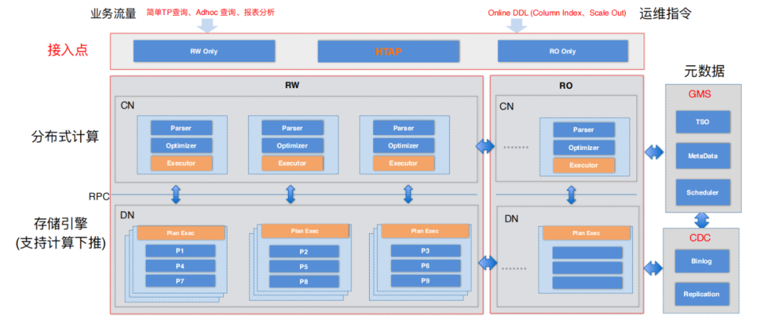 PolarDB-X采用经典的两层架构,分计算层和存储层。计算层用的PolarDB-X,可以独立水平扩展、扩缩容,各种能力完备。在整个系统里,一条SQL经过自研的解析器、优化器,得到分布式的执行计划;然后发送到存储节点执行;在中间的网络传输层,使用了定制的RPC协议,效率远高于传统的JDBC协议;之后执行计划会发送到PolarDB-X的执行引擎里去做具体的计算。