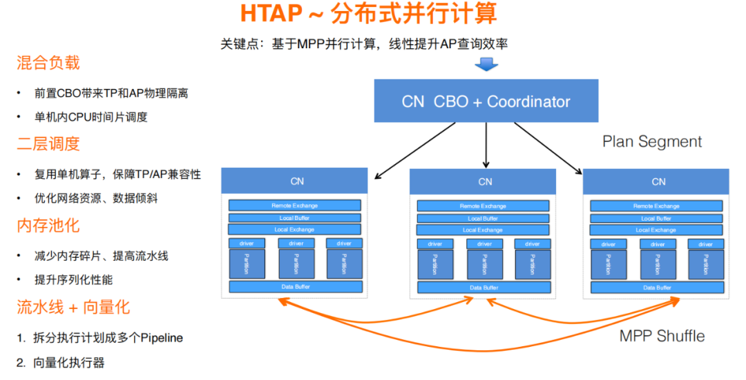 具体来看,在MPP并行计算中,PolarDB-X做了两层的并行,第一层是节点之间的并行,第二层是计算节点内部的运行。分为两层的好处在于能够减少调度开销,减少数据传输的开销。除此之外,PolarDB-X还做了内存池化、流水线化、向量化等精细化的技术,通过向量化提高执行器的执行效率,通过流水线化增加并行度减少数据物化。这些技术使得PolarDB-X在执行复杂SQL查询时具有较高的效率。